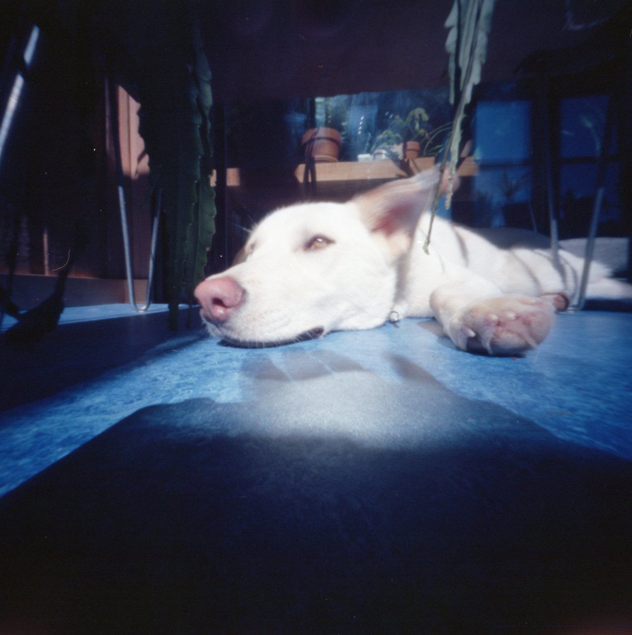 At least a few reviews I read recommend that you cover the pinhole window with a finger because sliding the lever can make the camera shake. So: cover the window, slide the lever to expose the pinhole, move your finger away for the time of the exposure, put your finger back, slide the lever closed. This lack of precision is right up my alley, but I also worried that my finger would end up in the field of view. And it did!
