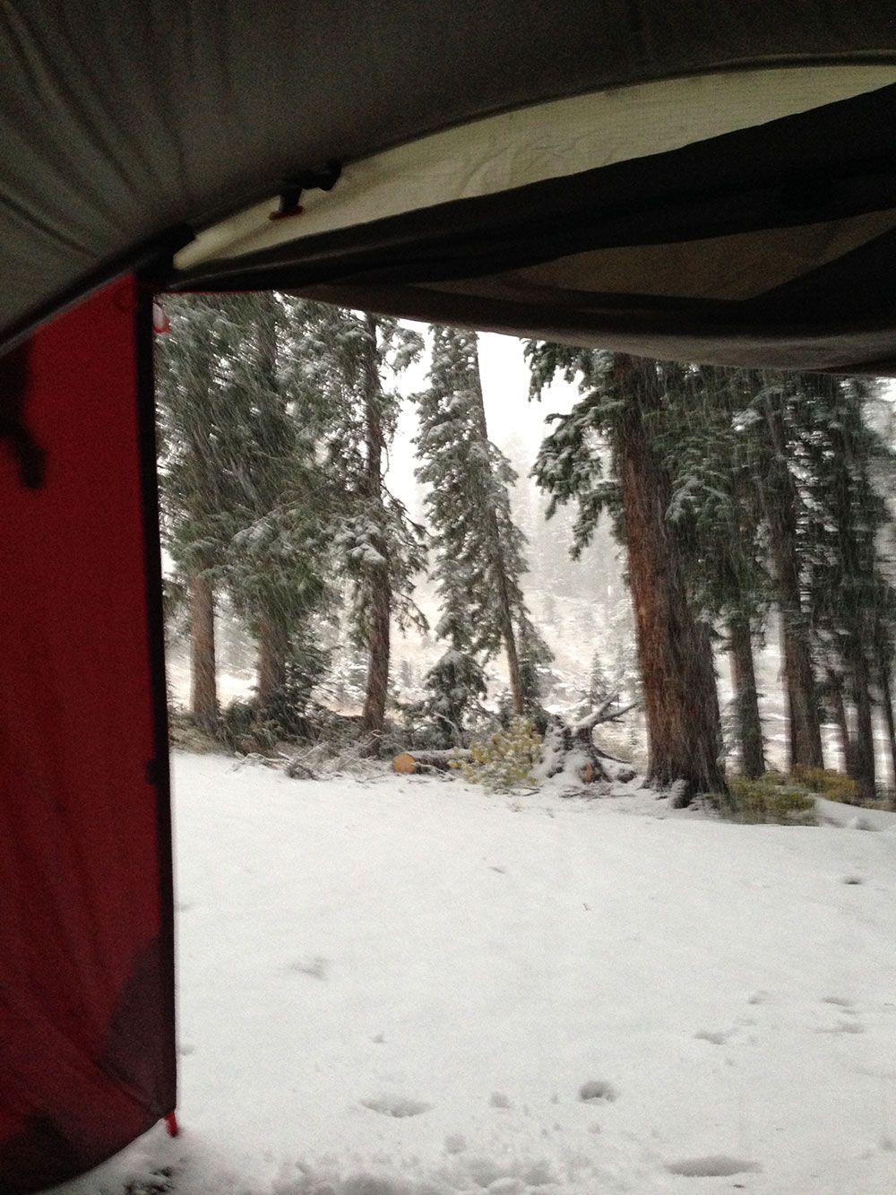 In the early morning we heard the unmistakable sound of snow hitting the tent, but eventually it quieted down. Turns out, that was because so much of it fell that it created some insulation from the sound. It was dumping sideways snow when we finally opened up the tent, and we were totally socked in. The cows had moved in, too, and even a couple of dogs barking at them couldn’t get them to budge.